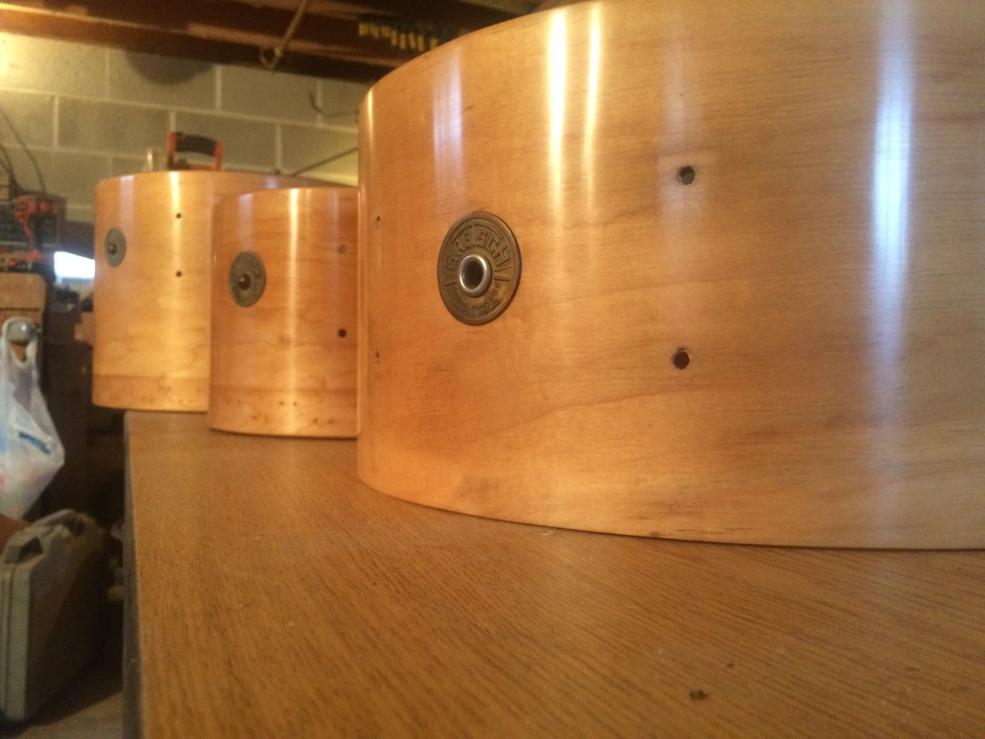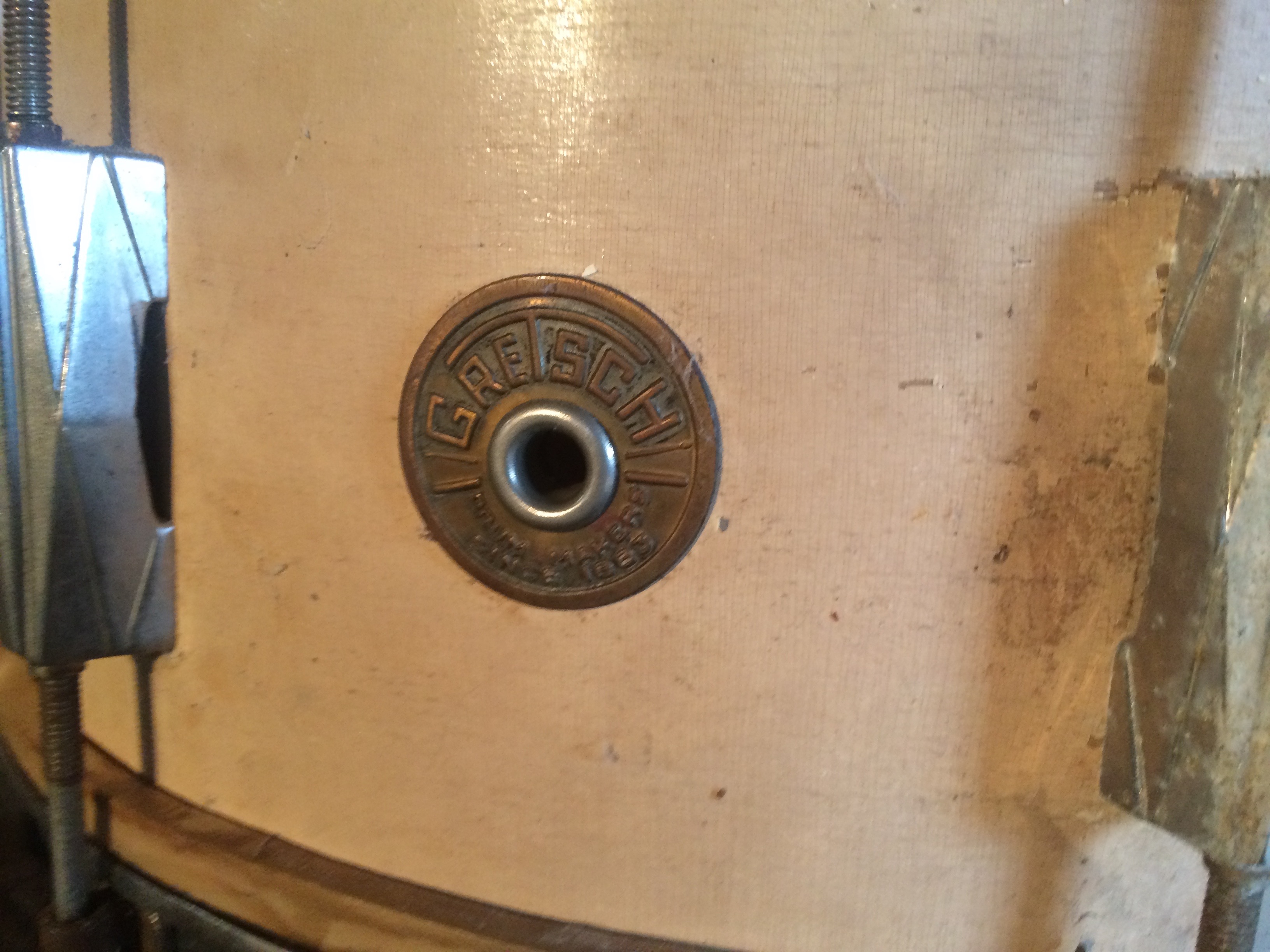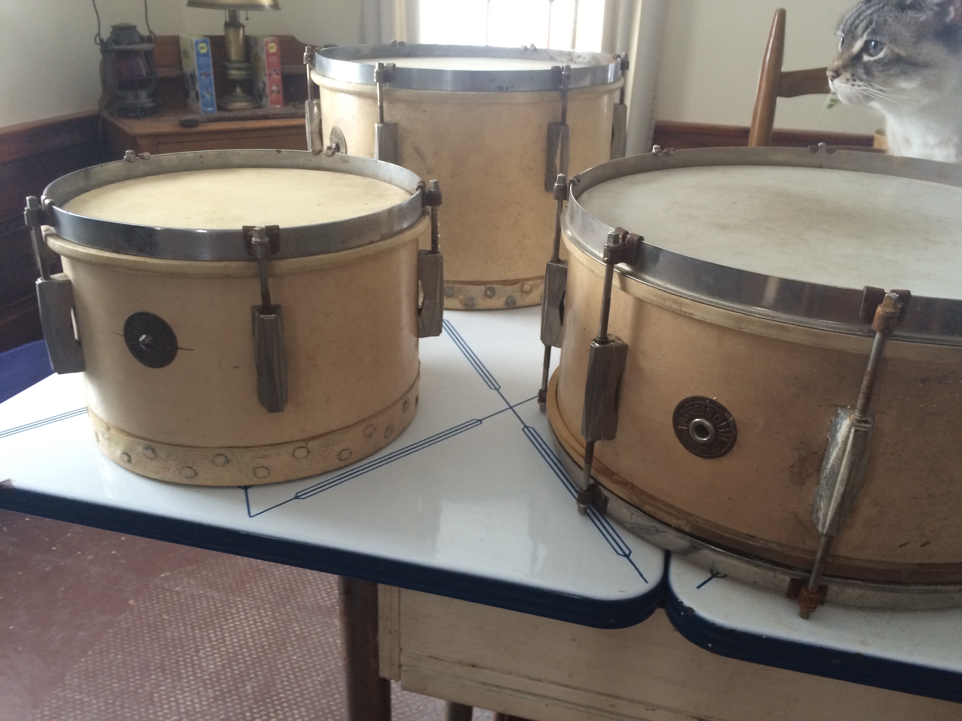I’ve been a drummer most of my life. My first kit was the obligatory crappy CB700 which, in combination with selling a pair of skis, got me my second kit which was a not much nicer Ludwig “Rocker II”. I threw a lot of work into that, trying to make it sound decent. I collapsed the shell on the snare drum eventually and thats about where I got into restoring drums. Somewhere along the line, I played a very nice Leedy kit from roughly 1952 and it changed not only my approach to playing but my understanding of what a drum should sound like. Fast forward a million years, thumbing through a local junk collectors shop, these three Gretsch drums turned up, along with a trunk of miscellanea, stands, pedal, a couple of trash cymbals from the era. I snagged the whole deal up for about 100 bucks and went on my way. I’d never dealt with tacked calfskin resonant heads but I knew the snare alone was easily worth the price I left with him.