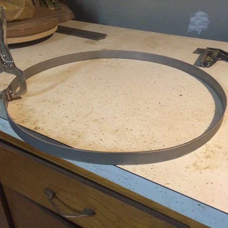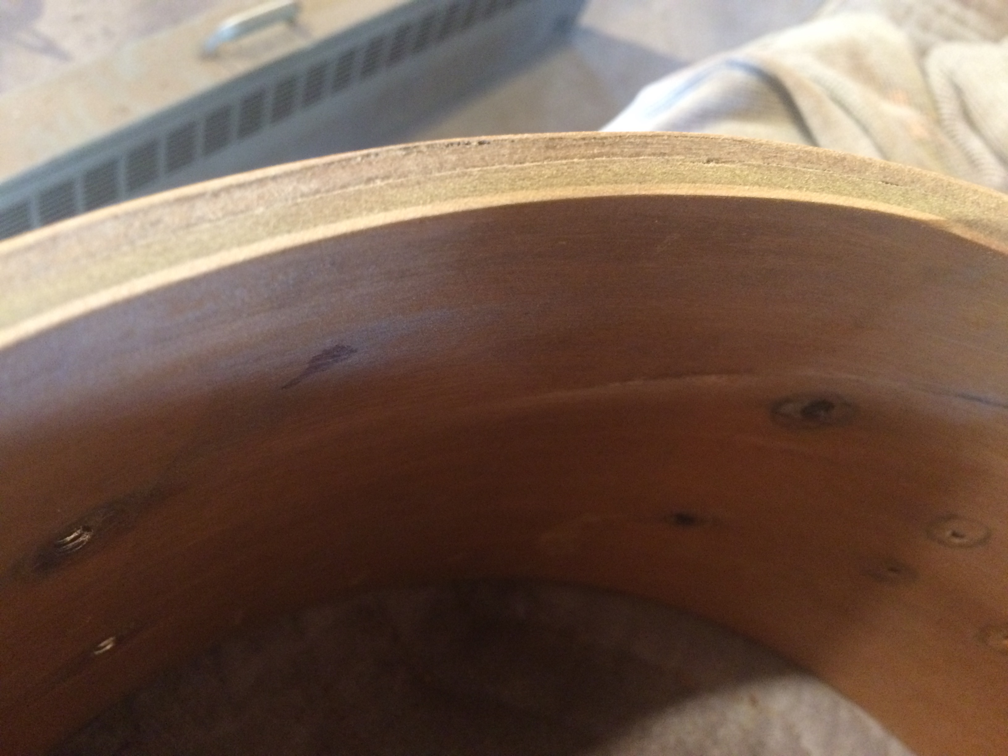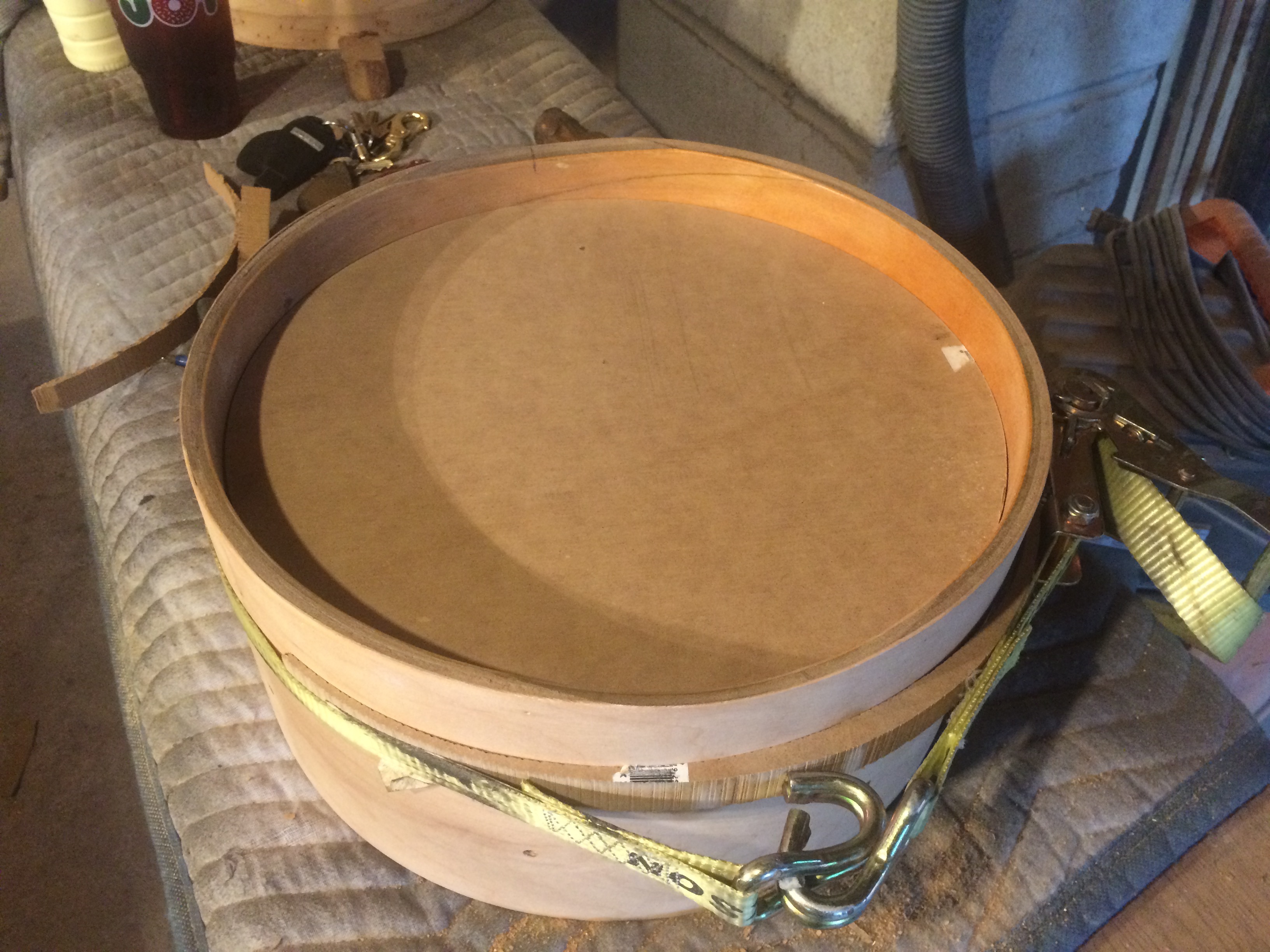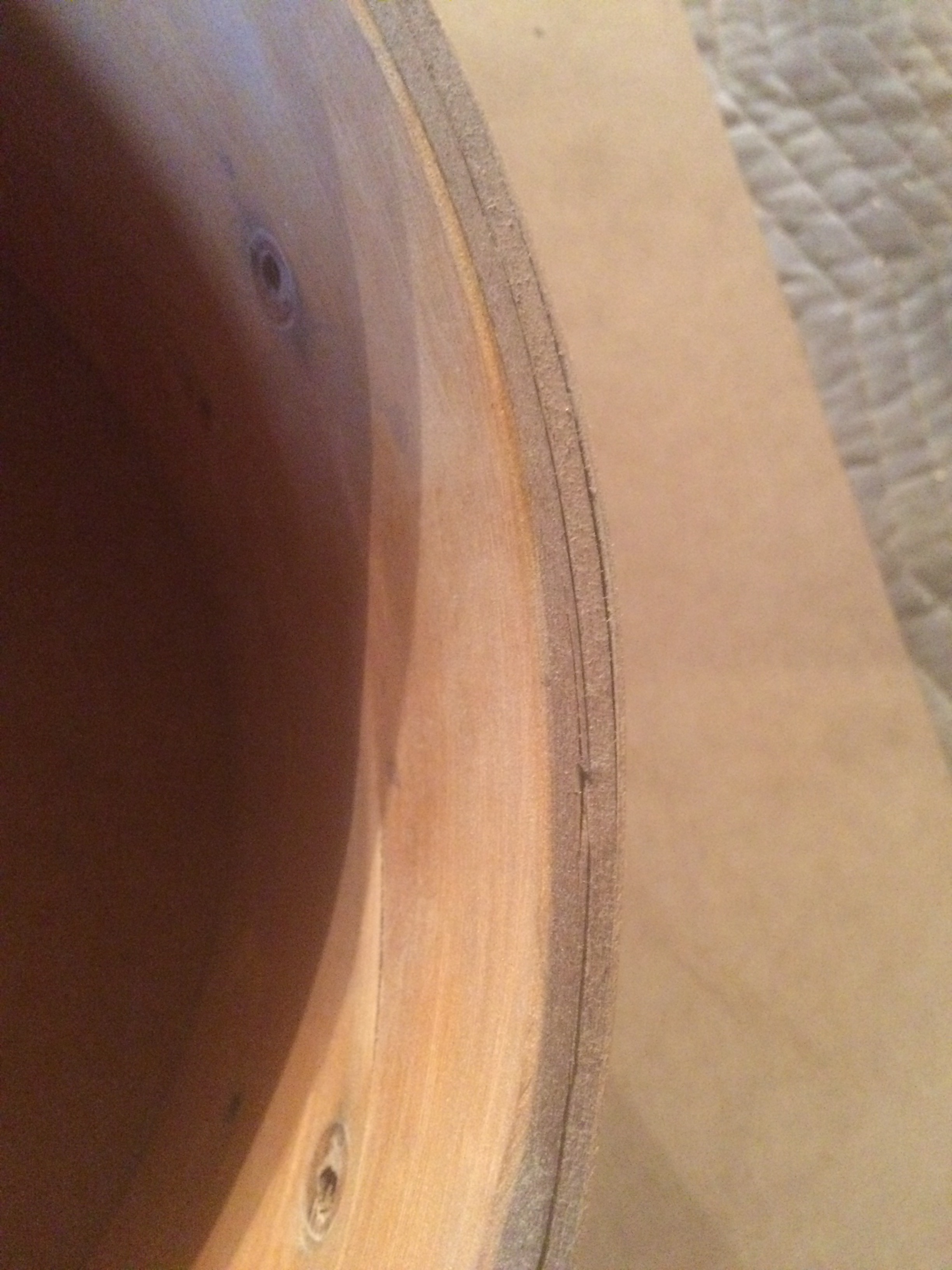 For the snare, I built an inside bolster to clamp against and filled the crack with wood glue. After holding with a ratchet strap for 32 hours or so, it held up well. I moved the bolster up even to the top to clean up the contact edge with a custom filed router bit that I would later use to cut contact edges into the scratch made 18″ floor tom.