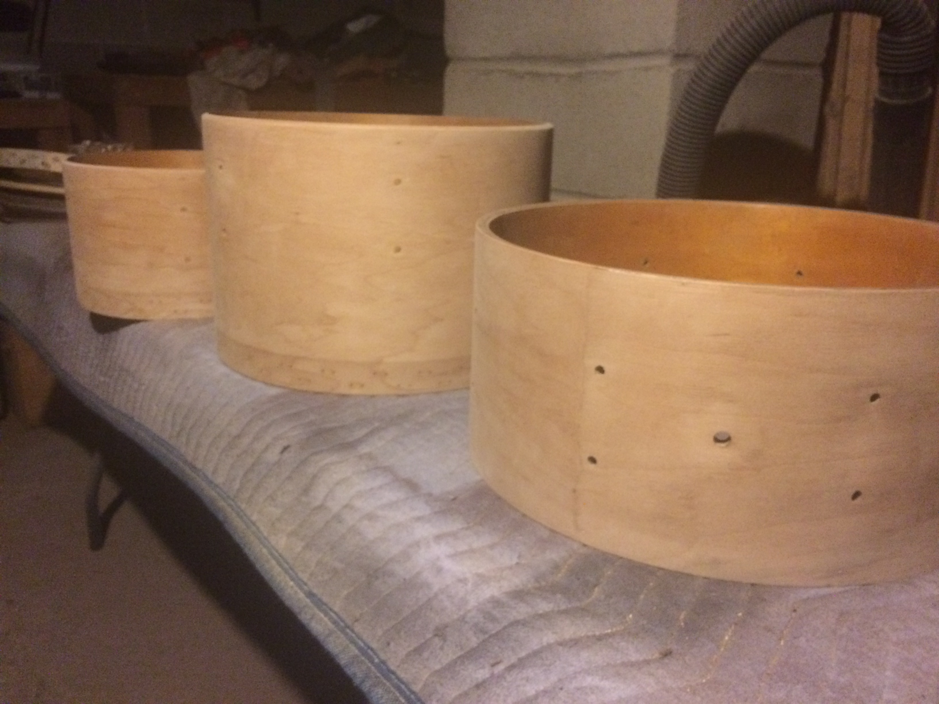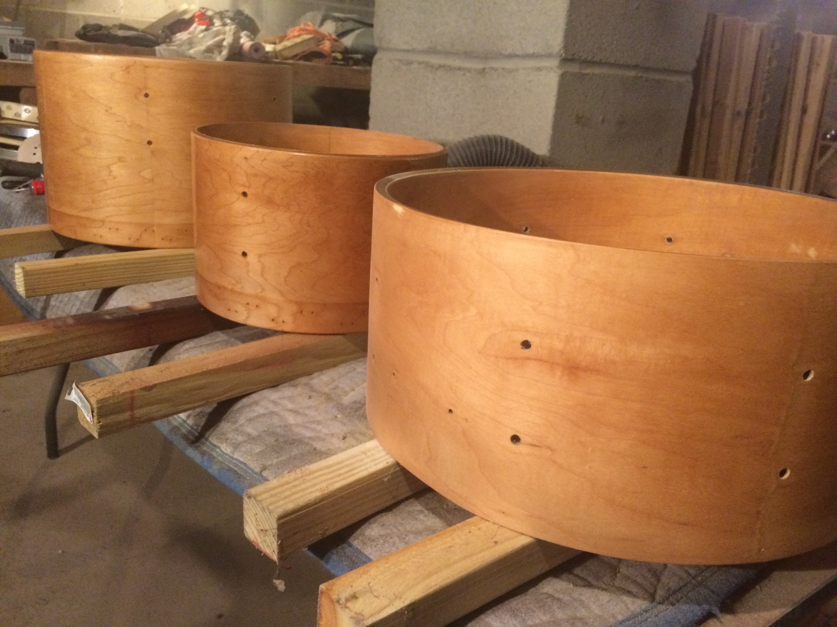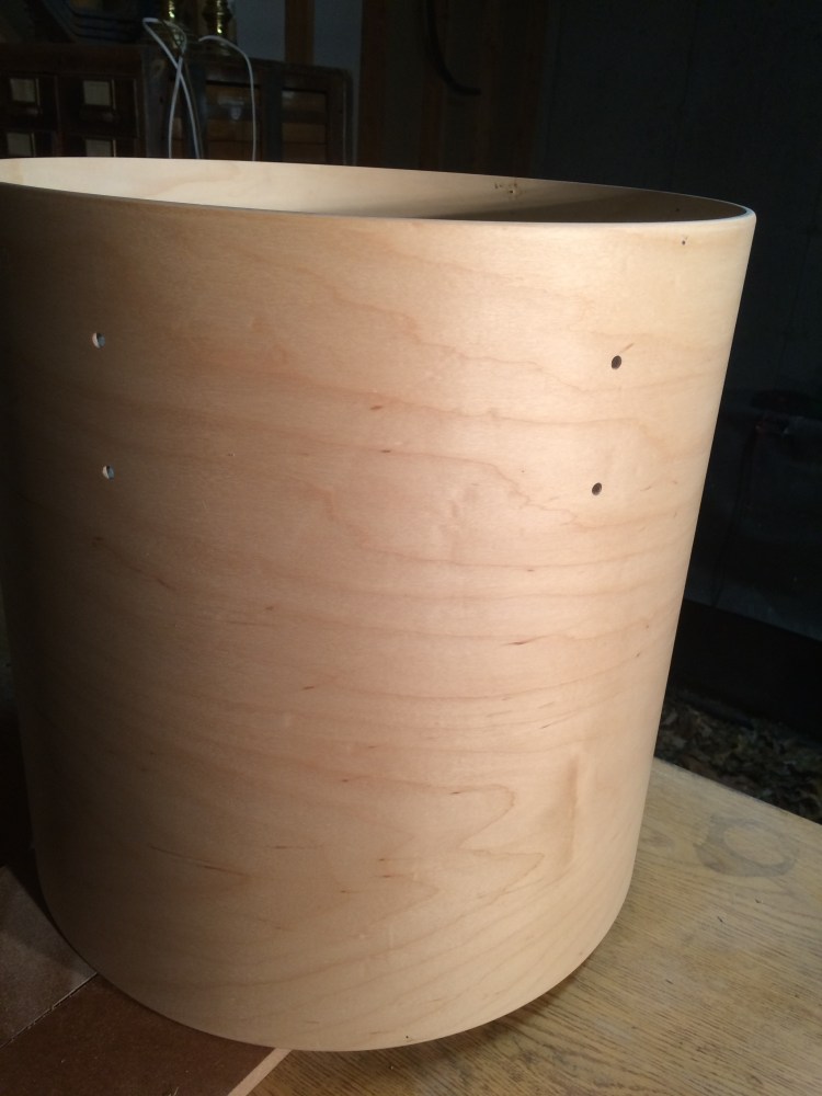 I’d never built a drum before so I based this one off what I’d known of laminated shells. I built an internal structure 1/4″ shy of the 18″ outer diameter I required and laminated a thin layer of maple, followed by 3 thicker layers of poplar and one more maple … The end result finished lighter than the rest of the kit but .. it’s Nitrocellulose .. it’ll be yellow in no time.