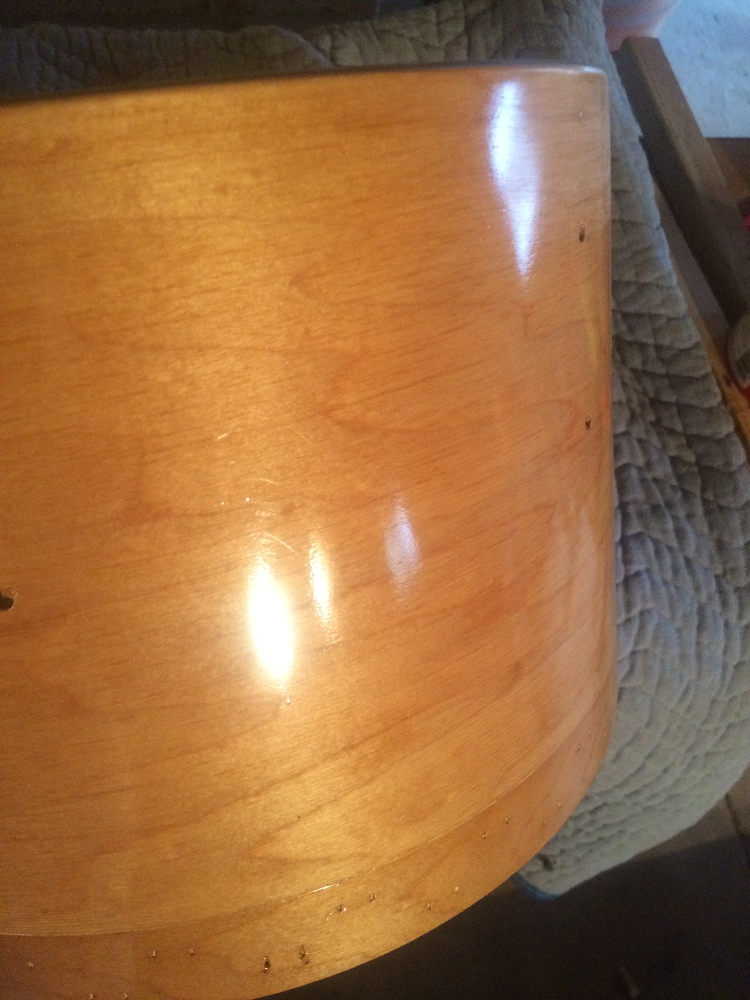 Aside from some discoloration that would be hidden by the heads, badges and lugs, there wasn’t much glaringly amiss in the shells. I doweled in a few places where provisions for mounting hardware had been and shot them with 3 coats of clear Nitrocellulose Laquer which, not being correct for the kit itself, really made the grain deepen and breathe.