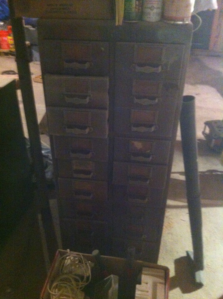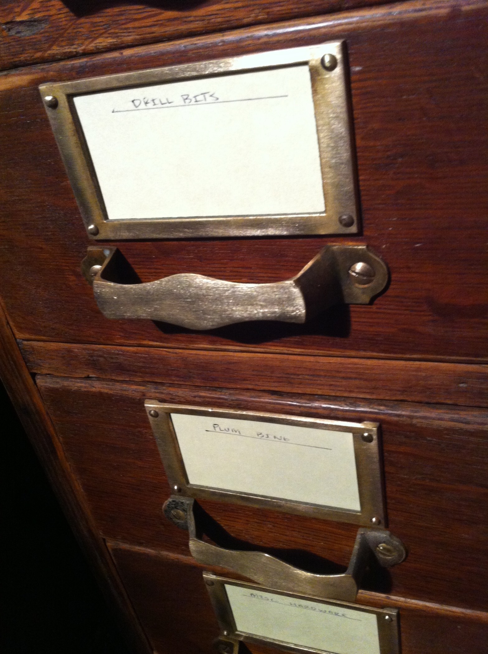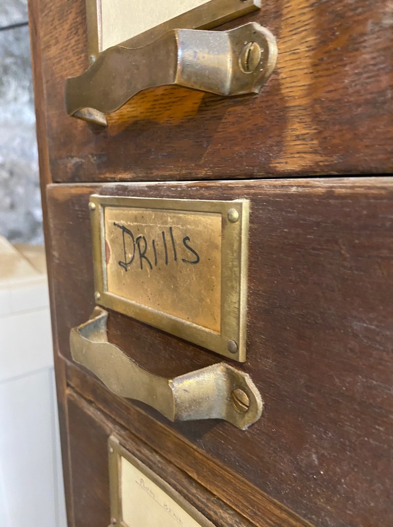 The “Drills” card was the only one left from the time it was in my grandfathers basement and so it remains. The other memory I had was that when my grandfather labeled his Plumbing drawer, he wrote “Plum” to big and had to switch to underneath that to write the “Bing” so “Plumbing” to me will always be “Plum Bing” and is to be labeled as such.