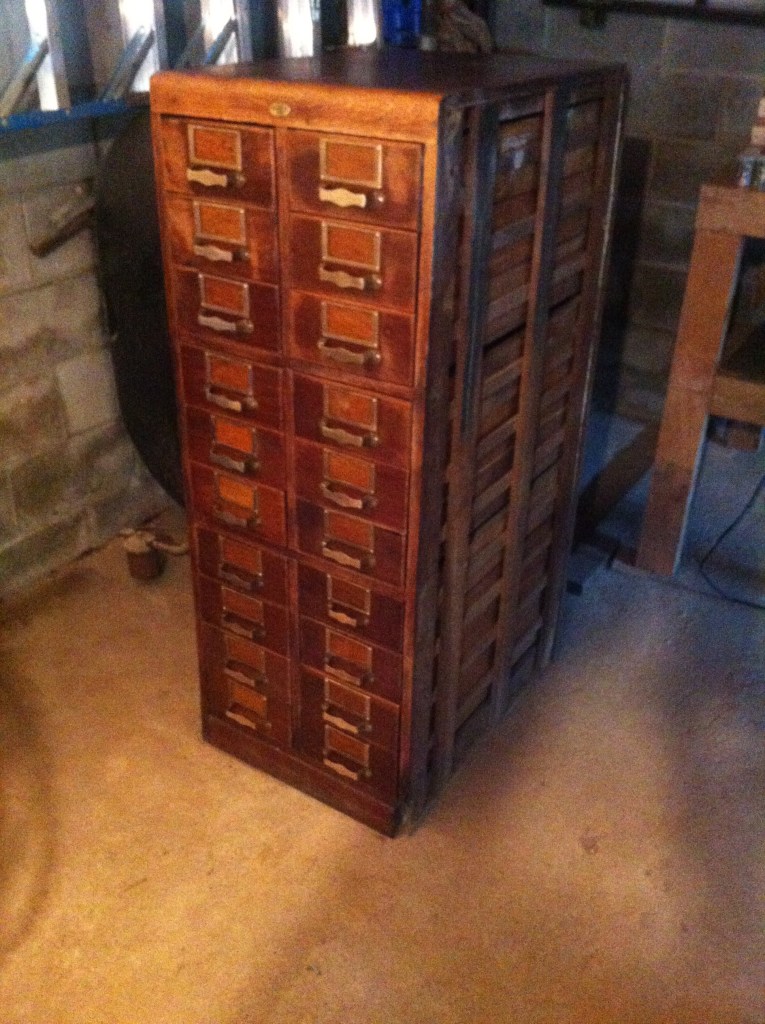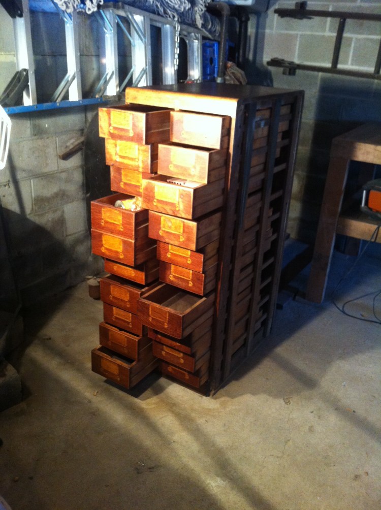 An old filing cabinet module that belonged to my Grandfather. I was obsessed with my grandfather’s workspace when I was a kid. He did a lot of electronic work … televisions, radios, amplifiers…. Of the many many fixtures in his shop (one of which was a collection of vacuum tubes I’ll never see the likes of again), this was central to my understand of creative spaces and remains a central fixture in my shop to this day.
