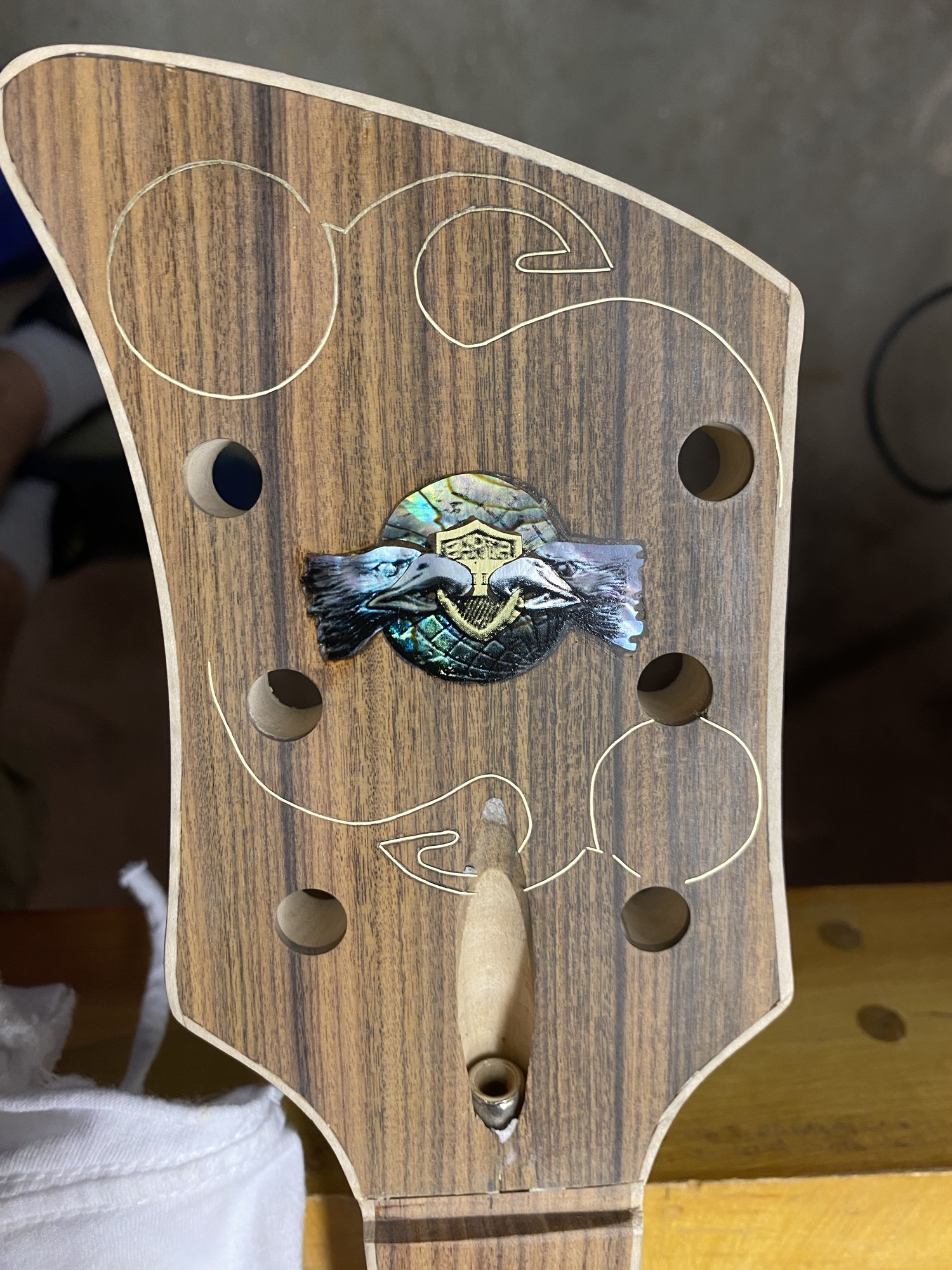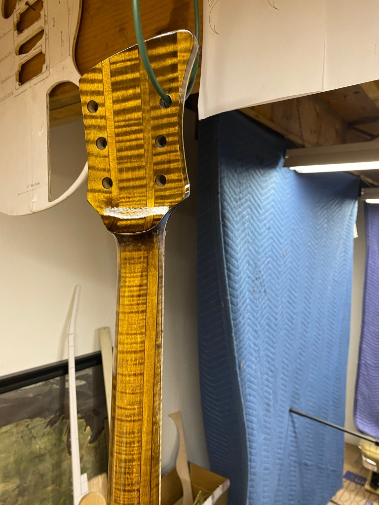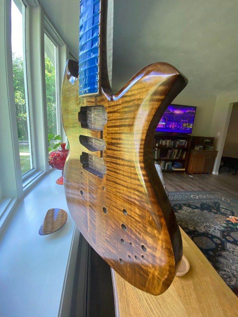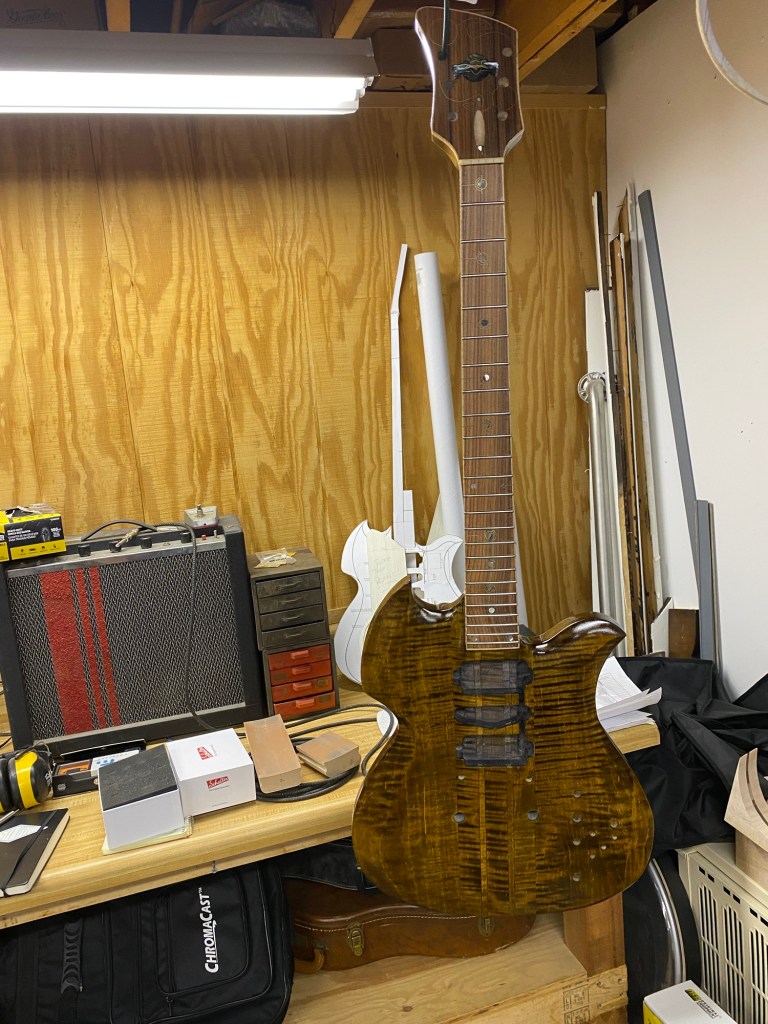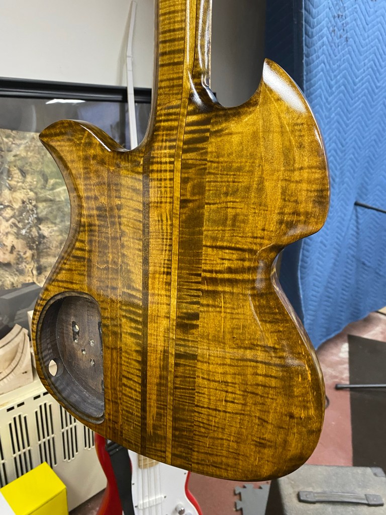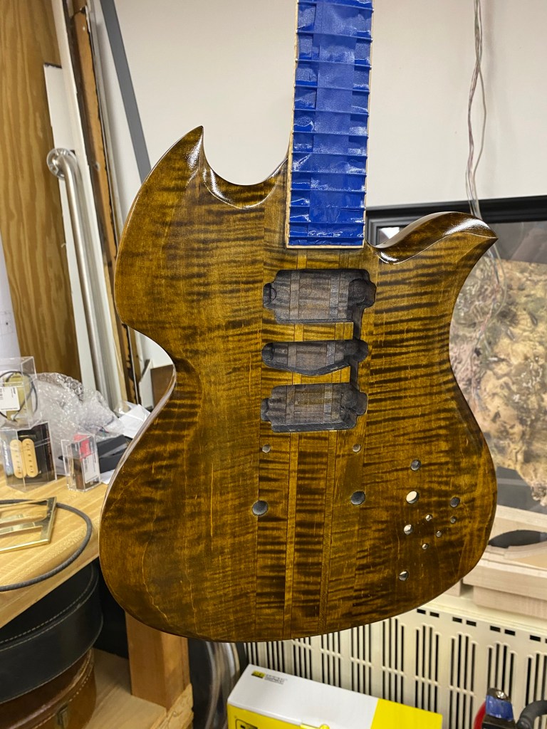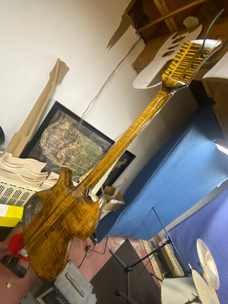 Should look nice with the gold, brass and Cream hardware. She was clearly inspired by my favorites, BC Rich Eagle and Mockingbird, The Gibson SG, a little Rickenbacker in the Gumby head headstock.