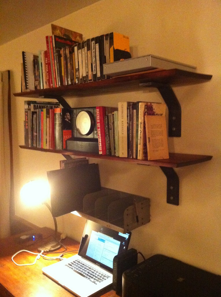 The place had one closet in the bedroom (which had no door … more on that later) so I built a number of wall mounted storage solutions. One, a true to aesthetic coat rack for the entryway to the dining room of pine board and doweling matching the existing trim. Two, a set of bookshelves for over the desk in the living room, fantastically overbuilt as I was working on a metal production floor at the time with access to steel that was, just SO over the top. The steel brackets bolted straight into the studs of the outside wall of the place. Real pretty … heavy … but real pretty.