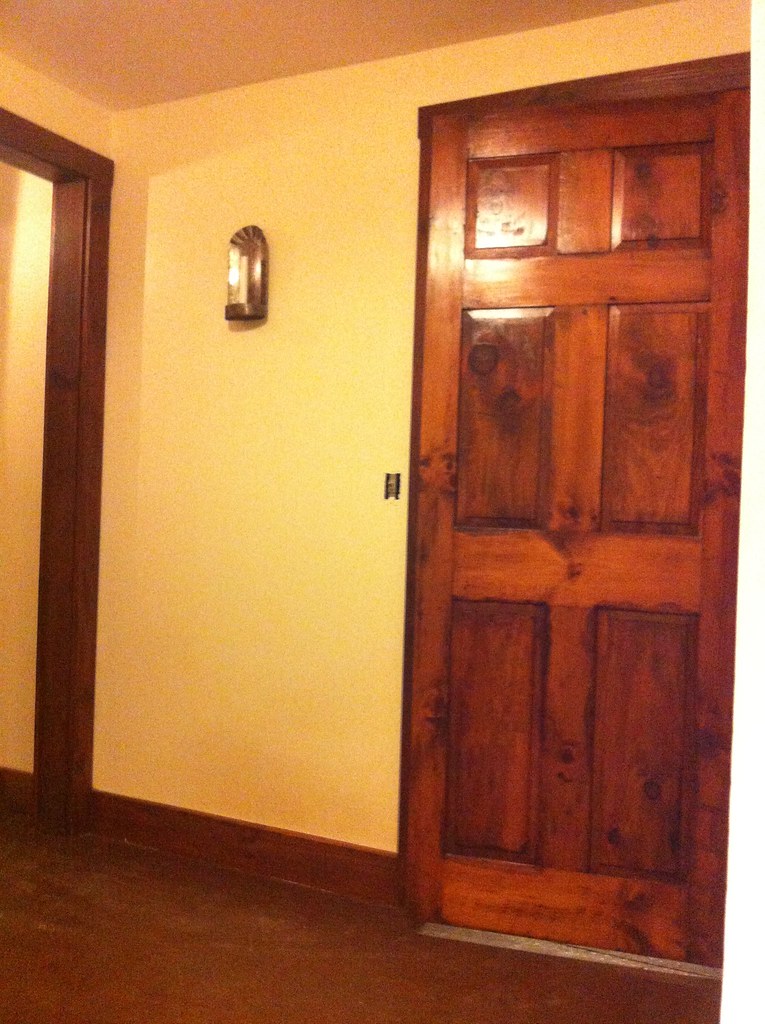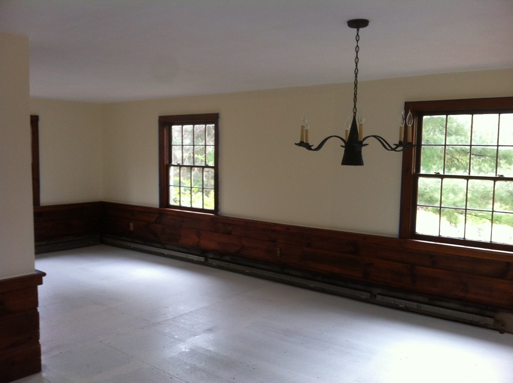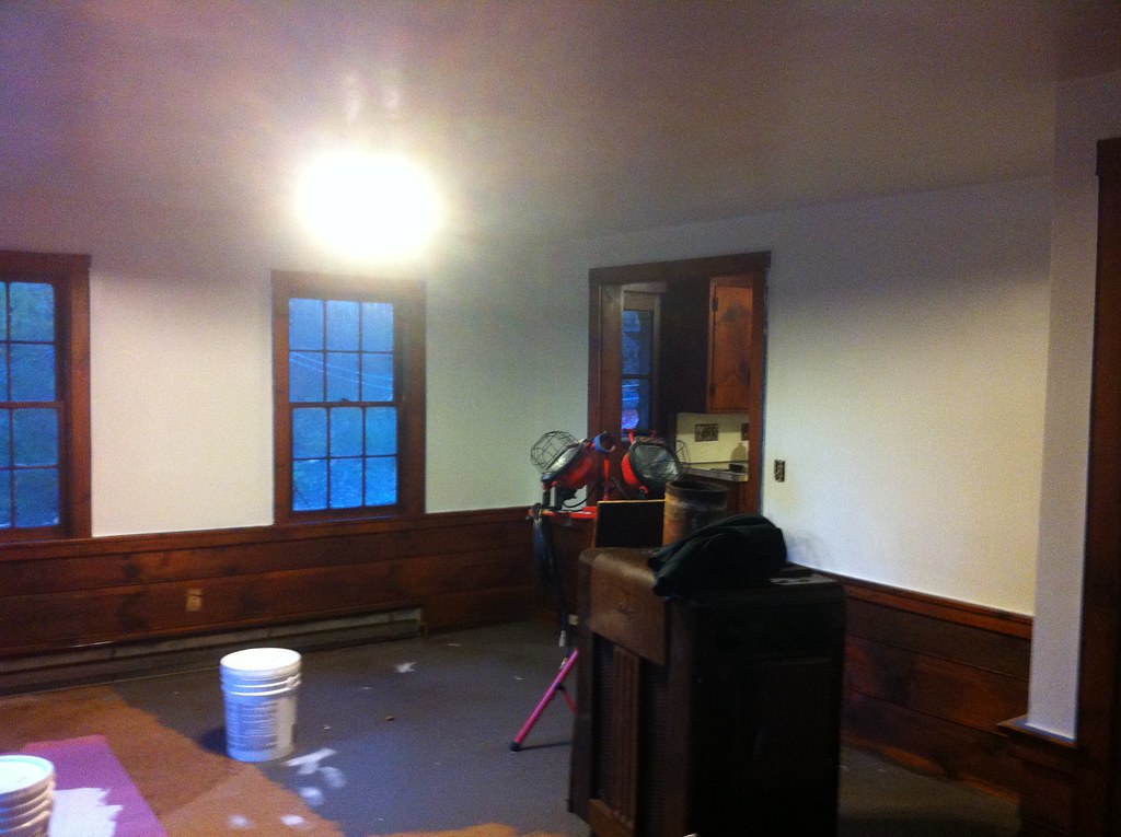 The cleaning took a few weeks between the walls and the knotty pine trim. The floor was another question altogether. There was linoleum laid on most of it, though not adhered, with carpets here and there. The subfloor was particle board, which thankfully didn’t get any water. Again, had I owned it, I might have done something more permanent … at the time though, affordable, durable options were few. So I opted to clean it as best as I could and seal it with primer, then lay several coats of Acrylic floor paint and use rugs over that.