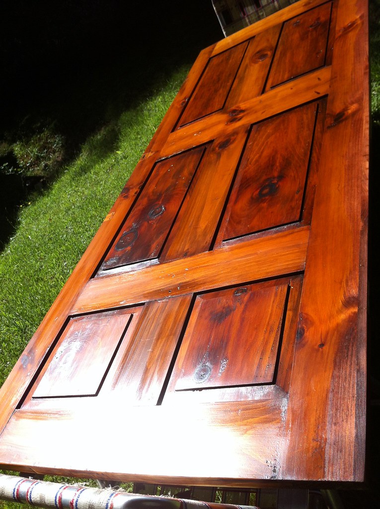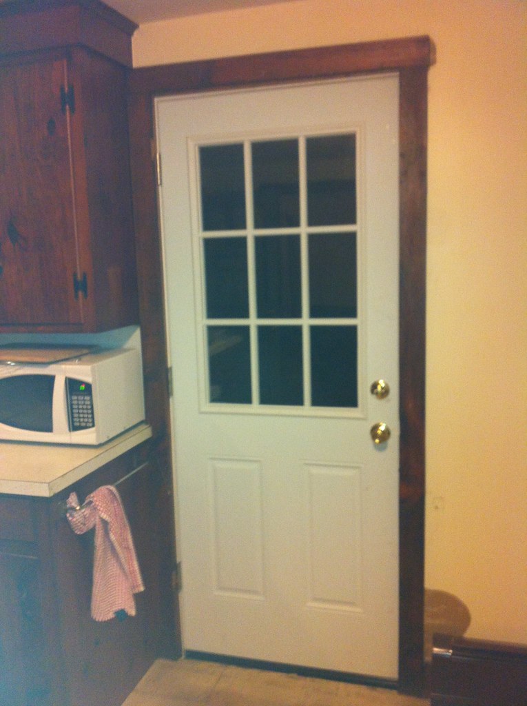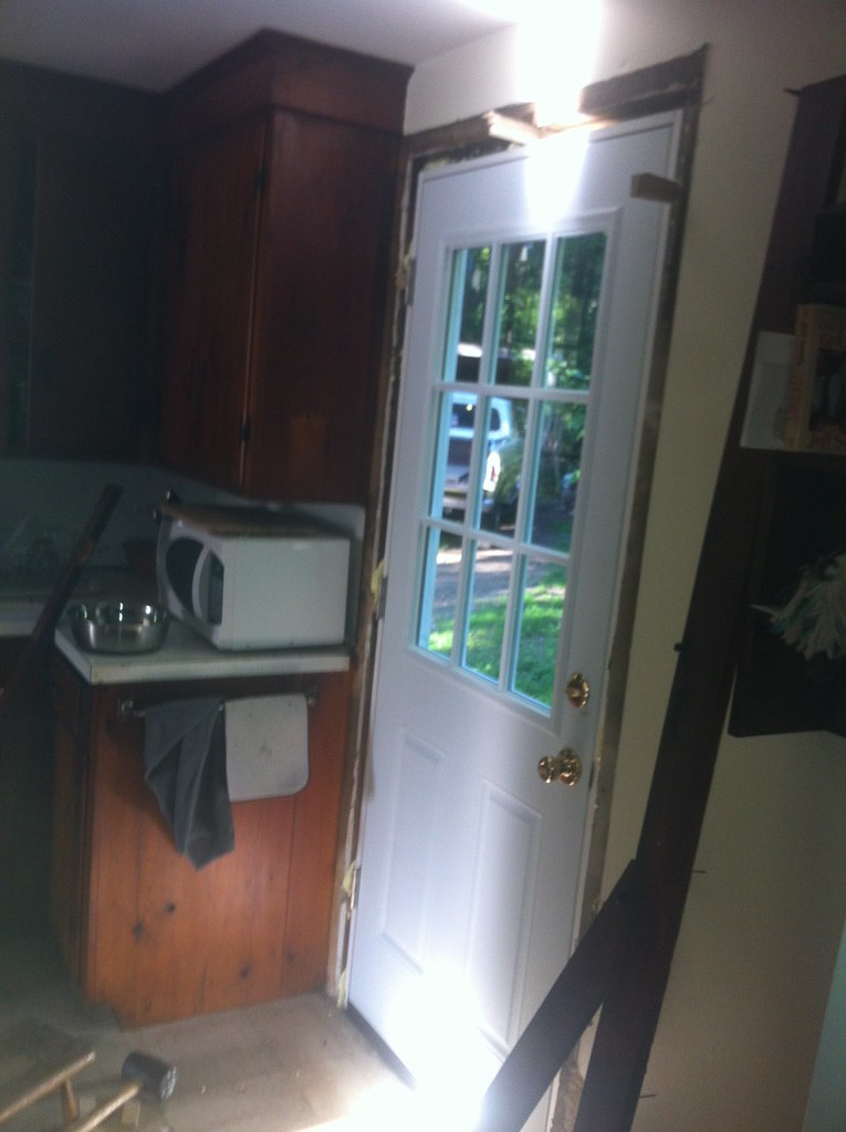 The main door was in good enough shape overall. It was painted and sealed before installing a new storm door. The back door was another issue. It had been closed up for a long time with insulation between the inner and outer doors. Whatever structure it led to was long since gone leaving a good 5 foot drop outside. I opened it up and cleaned it out saving the inner door for refinishing and use elsewhere. Pulled the frame and trim and replaced it with a new half glass door and a new storm door. The original inner door was cut and refinished in order to put a door on the bedroom from the kitchen. The following summer, after pressure washing the place (the P.O. USED ENGINE OIL TO PROTECT THE WOOD SIDING… ah …) I put a little deck out there which I was scarcely able to use.