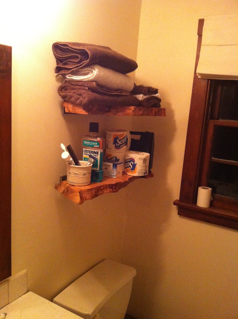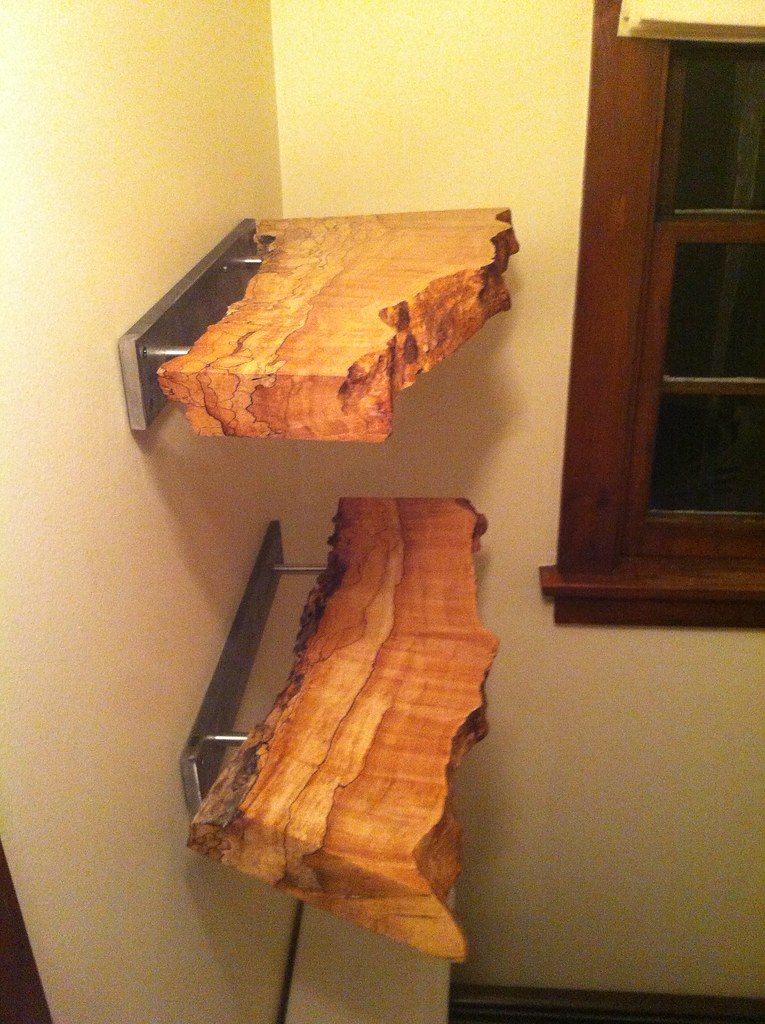 The bathroom needed a shower. After cleaning it up, replacing the toilet, and painting it (duh) I decided to rip the tub tile surround out, plumb a shower head and hook ups for a washer dryer in the space behind the stall. I simply rebuilt the valves though that left me with some finish work beyond the tile as the space between the knob and the wall was too big. I built some bushings out of Black Palm Wood and sealed them in epoxy resin. Again with the heavy steel stuff, I’d been carrying around these spalted maple blanks for a few years and they made nice little over the toilet shelves which was nice as there was no medicine cabinet.