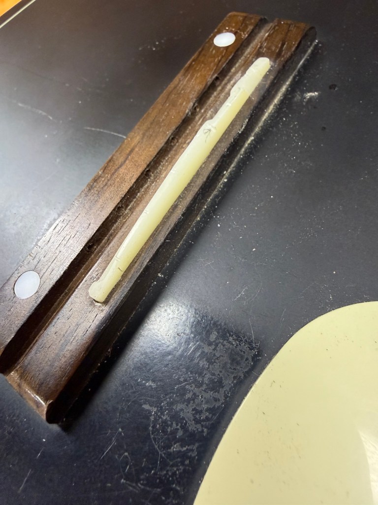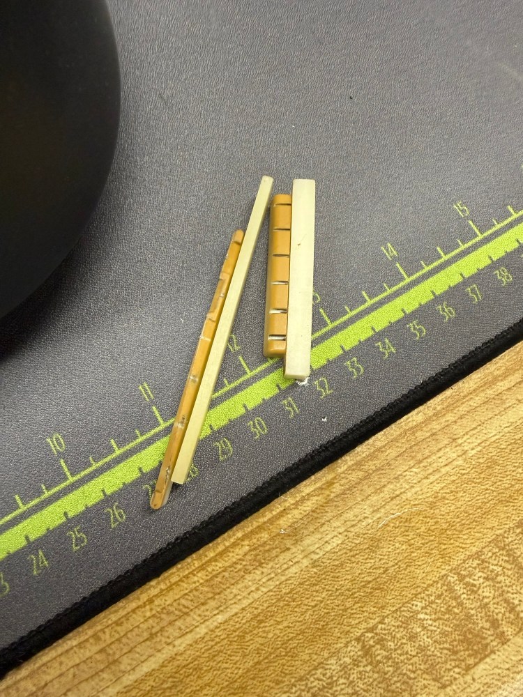 A lot of these cheaper models are built well enough from the perspective of assembly. Where they suffer is in materials used, fit, finish, and set up. The main frustrations with this one was action, intonation, and sustain/overtone voicing. The action is a simple fix BUT, while dealing with that, it made more sense to cut a new nut and compensated bridge from unbleached bone to more closely adjust the intonation and to transfer vibration to the body more accurately. In the photo, the darker material is whatever composite material the company used for the bridge and nut. Not nearly as dense as bone, these components can castrate a stringed instrument’s tone and sustain. Further, the compensated bridge is cut via a pattern that is not necessarily in sync with the manufacturing tolerances of the guitar itself leading to tonal drift past the octave on the neck … not that that matters much on a guitar where it’s virtually impossible to play past the octave but, if it’s bad enough, you’ll hear it.