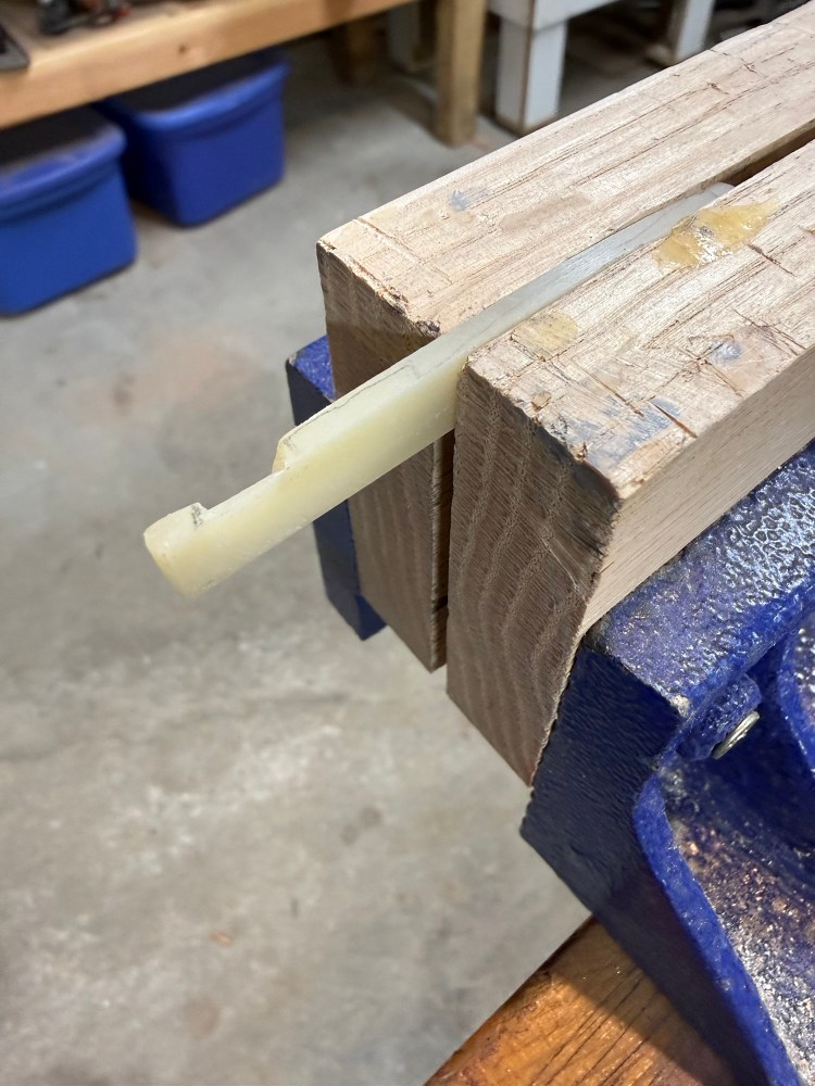 While filing the compensated bridge, I moved the 6th and 5th string compensation forward a bit as I kept hearing slightly flat notes higher on the fretboard. The 4th through the 1st string was a constant angle on the old bridge so I started that slightly forward and trailed it back to the original point of contact for the 1st string as it was stable from the start.
