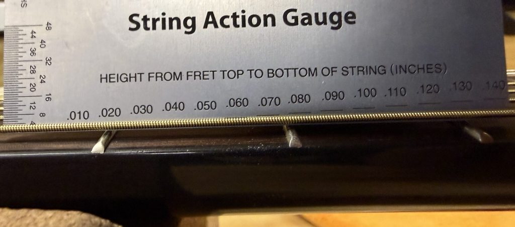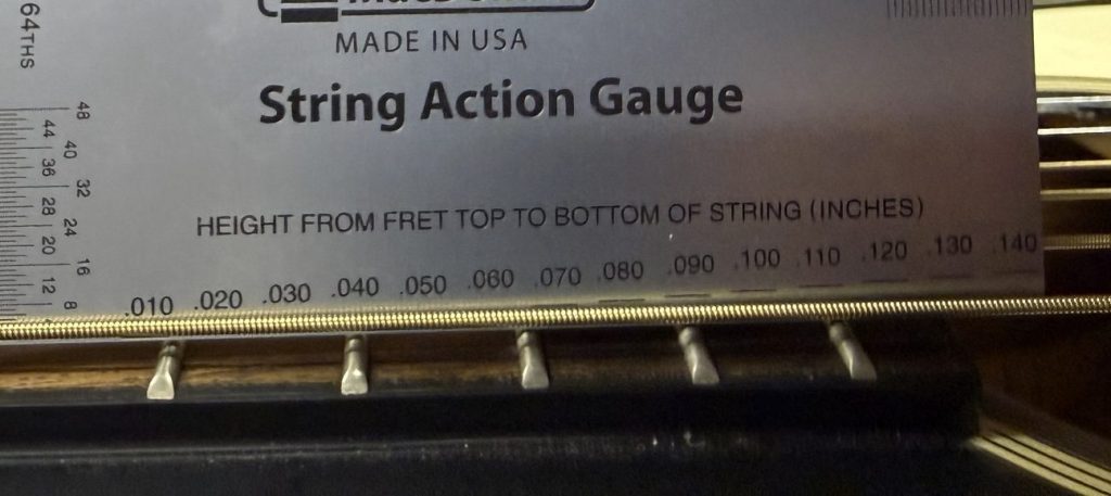 After checking the neck for straightness, I shaved the bridge down 1/32″ at a time until it mirrored the .030 fret clearance at the nut making the guitar playable top to bottom while keeping the strings off the soundboard sufficiently enough to not choke any tones out.