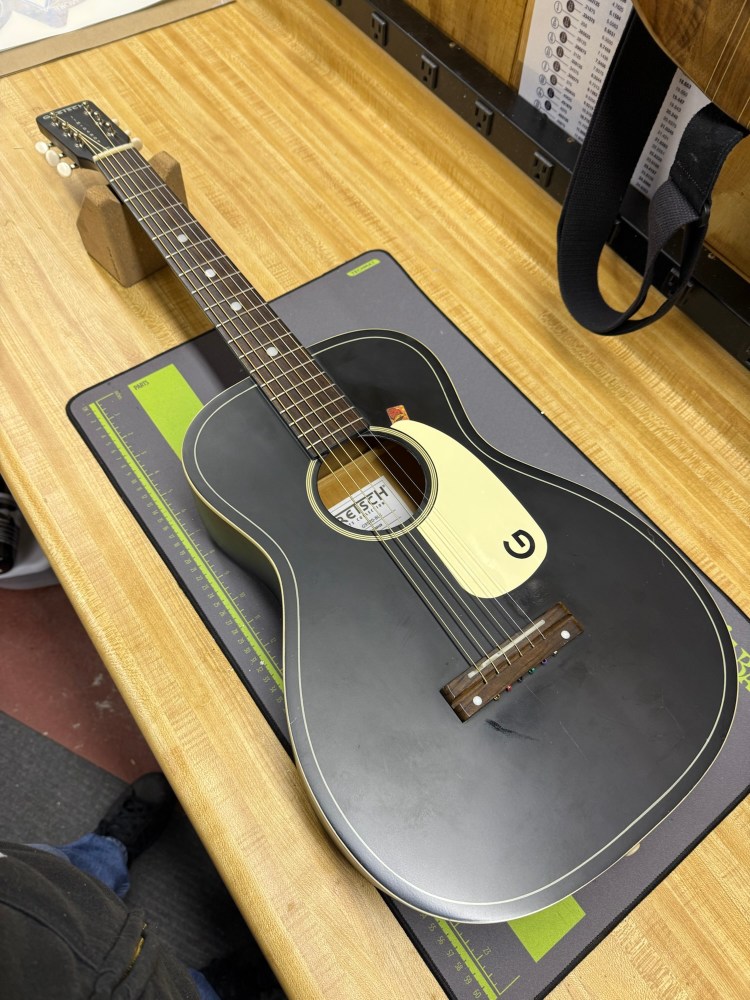 That said, this is more about the frustration a young or otherwise inexperienced player encounters on an instrument that was not afforded it’s justified attention, particularly in fit and finish. Some of the issues I’ve run into; crappy strings, action, and poorly leveled, dressed, or finished frets, are entirely correctable with little work. I stopped buying guitars a while ago now. But there’s a few I simply don’t have an amazing example of, namely a steel string acoustic, a classical, and a bass. To all of those, I’ve made due with a ‘lesser’ guitar. After some work, such as on the following Gretsch ‘Jim Dandy’, my want of a better instrument outweighs my NEED for a better instrument by leaps and bounds. Please forgive the griminess of this guitar. It travels a lot and cleaning it’s matte finish isn’t exactly high on the list…